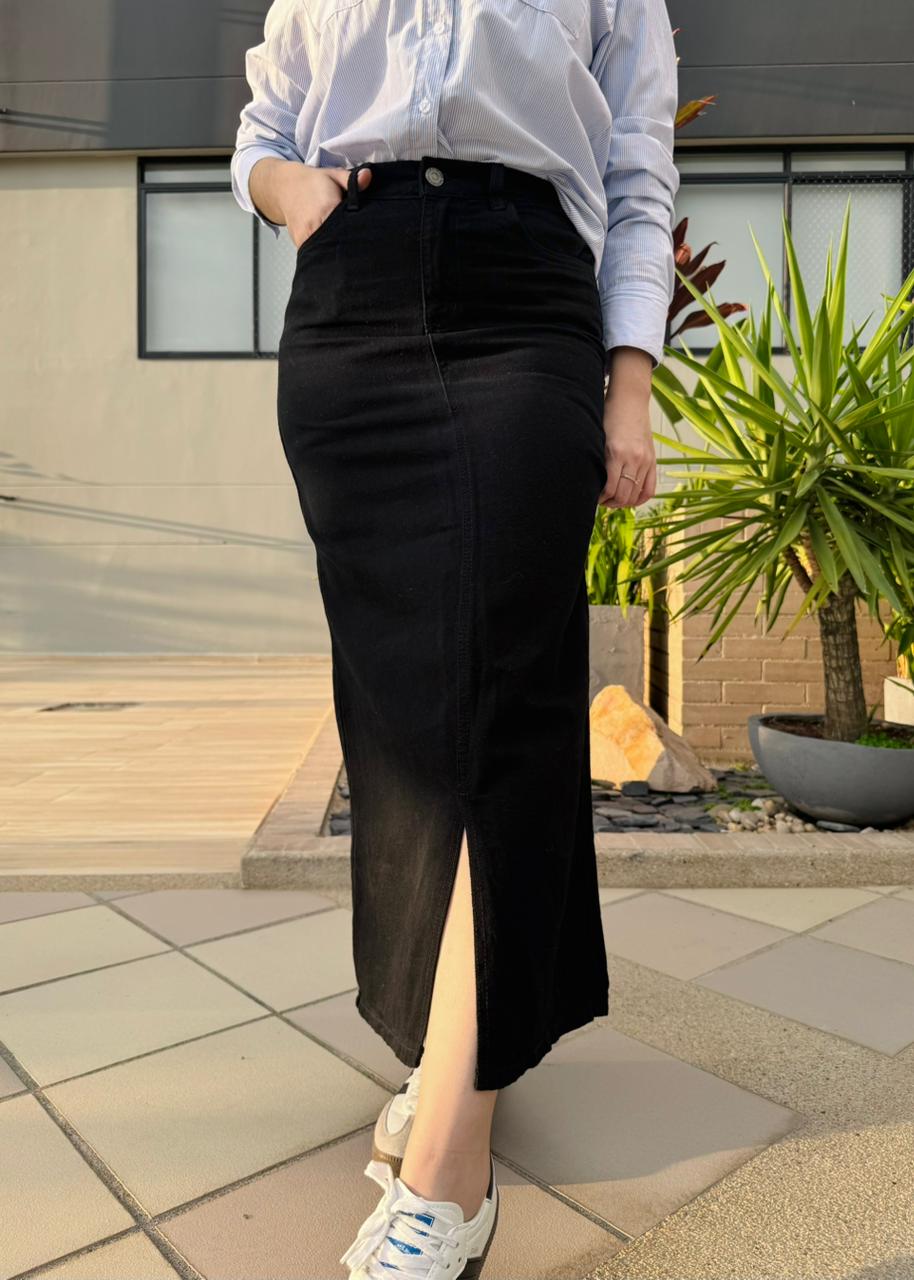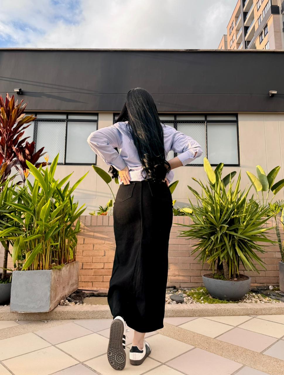 La Falda Denim Abertura Central está confeccionada en denim rígido, brindando un ajuste estructurado y elegante. Su diseño minimalista con abertura frontal aporta comodidad y movimiento, manteniendo un estilo sobrio y femenino ideal para looks versátiles y modernos.