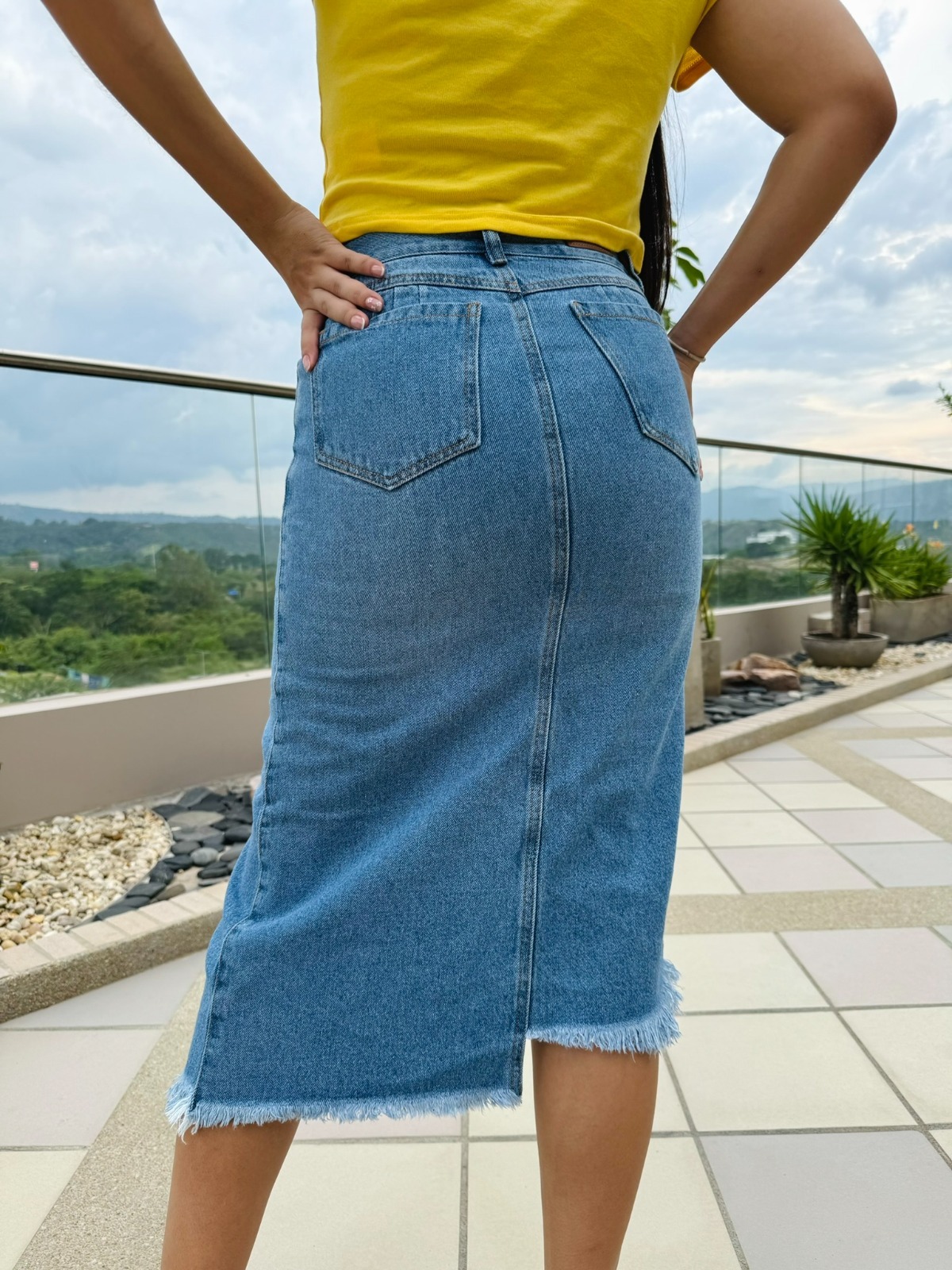 La Falda Denim Asimétrica Destroyer es una prenda audaz y moderna, ideal para quienes buscan un estilo único con un toque urbano. Confeccionada en denim rígido de color azul medio, su diseño destaca por una abertura frontal con corte en pico, que estiliza la silueta y brinda mayor comodidad al caminar. Además, el detalle de rasgado en la parte inferior y el dobladillo deshilachado le aportan un look desgastado y casual.