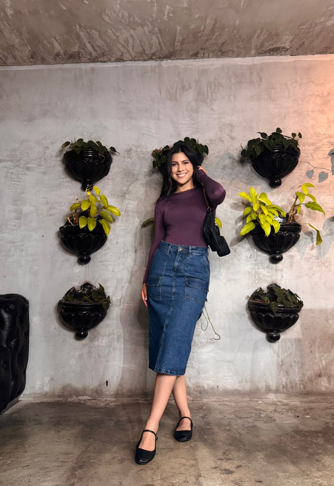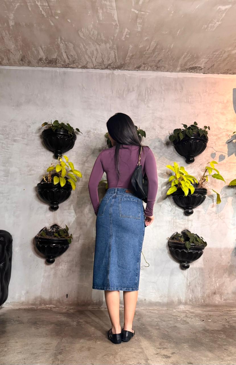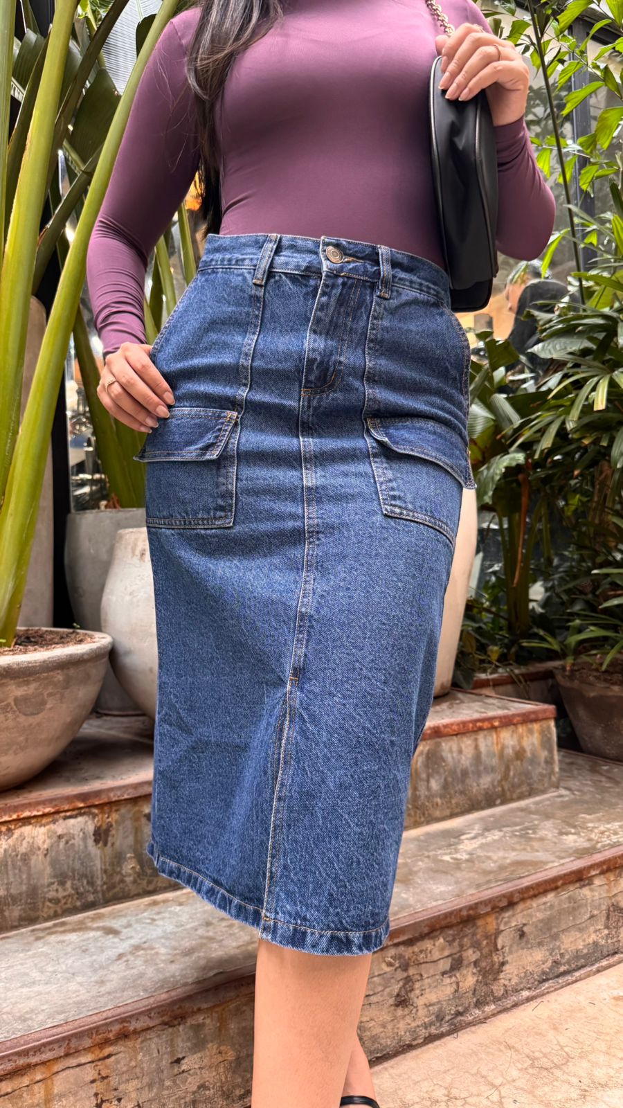 La Falda Denim Bolsillos Cargo está confeccionada en denim rígido de tono azul, con un diseño estructurado que estiliza la silueta. Sus bolsillos frontales tipo cargo y la costura central aportan un detalle moderno y funcional, ideal para looks sobrios y versátiles.