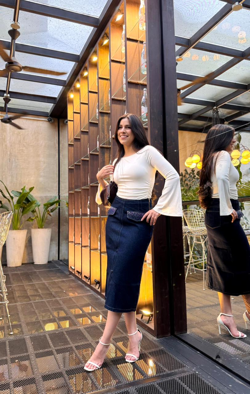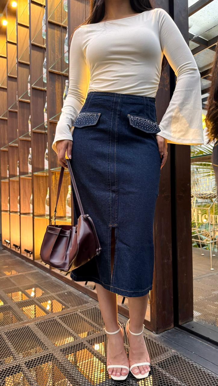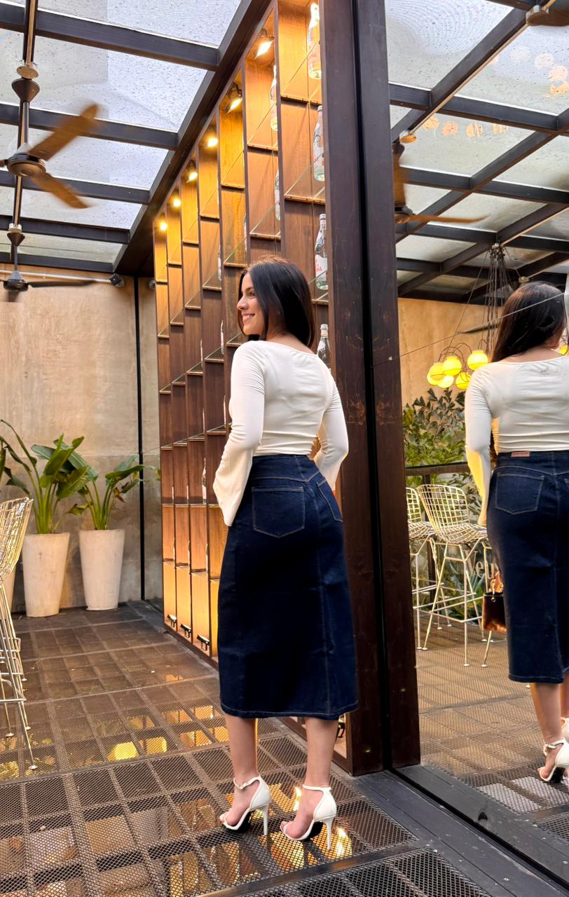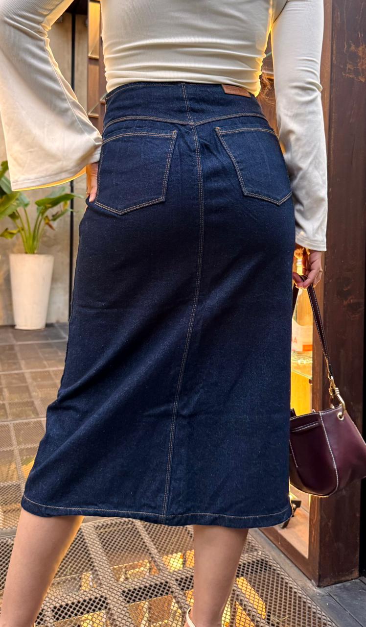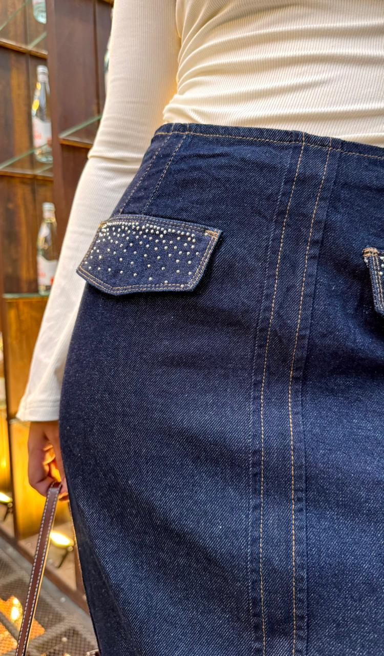 Sofisticada y funcional, la Falda Denim con Bolsillos de Solapa y Abertura Frontal destaca por su diseño estructurado y versátil. Confeccionada en mezclilla de tono oscuro, presenta dos bolsillos decorativos tipo solapa que añaden carácter sin perder elegancia. Su corte recto con abertura frontal la hace ideal para moverse con libertad mientras mantiene una silueta favorecedora. Perfecta para outfits de oficina o para elevar un look casual.