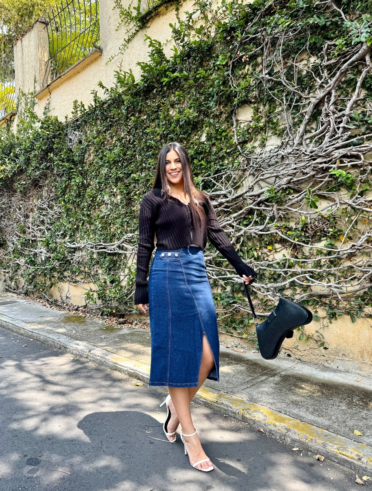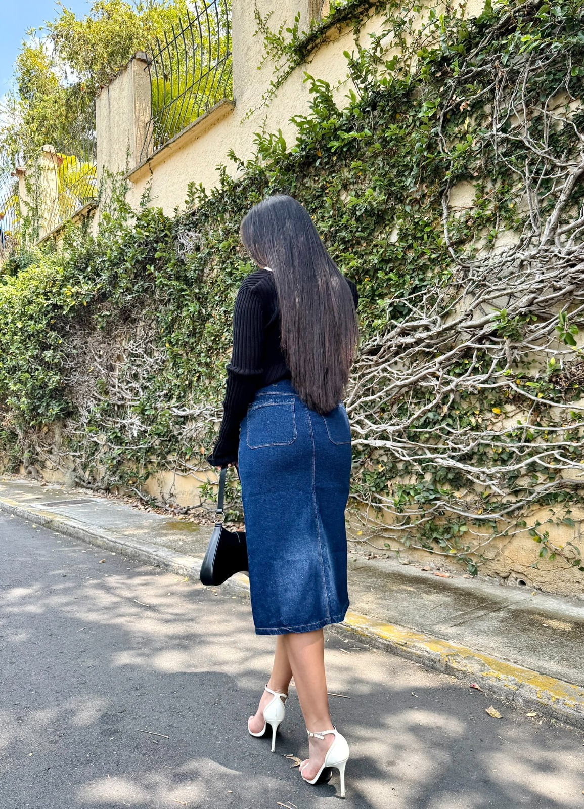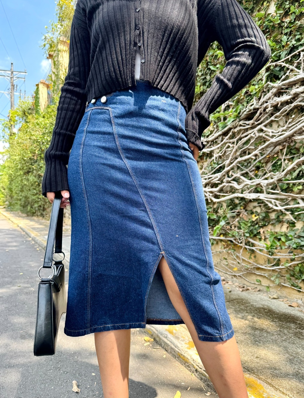 La Falda Denim Curves con Abertura es una prenda con un diseño estructurado y femenino, ideal para quienes buscan un look moderno con un toque sofisticado. Confeccionada en denim rígido de color azul oscuro, su diseño destaca por sus costuras curvas que realzan la silueta y una abertura frontal, que aporta comodidad y movimiento. Además, los detalles de botones en la cintura agregan un toque de elegancia.