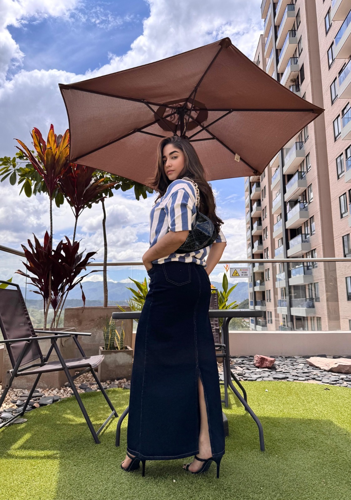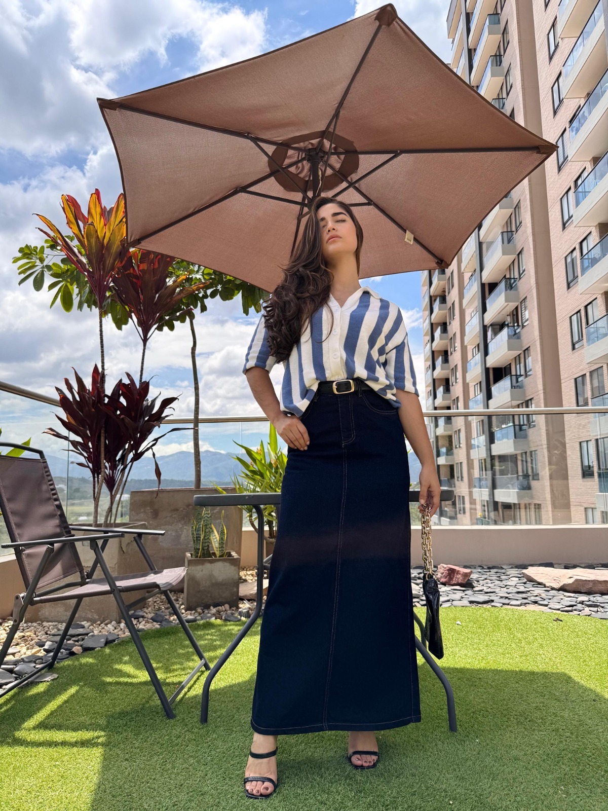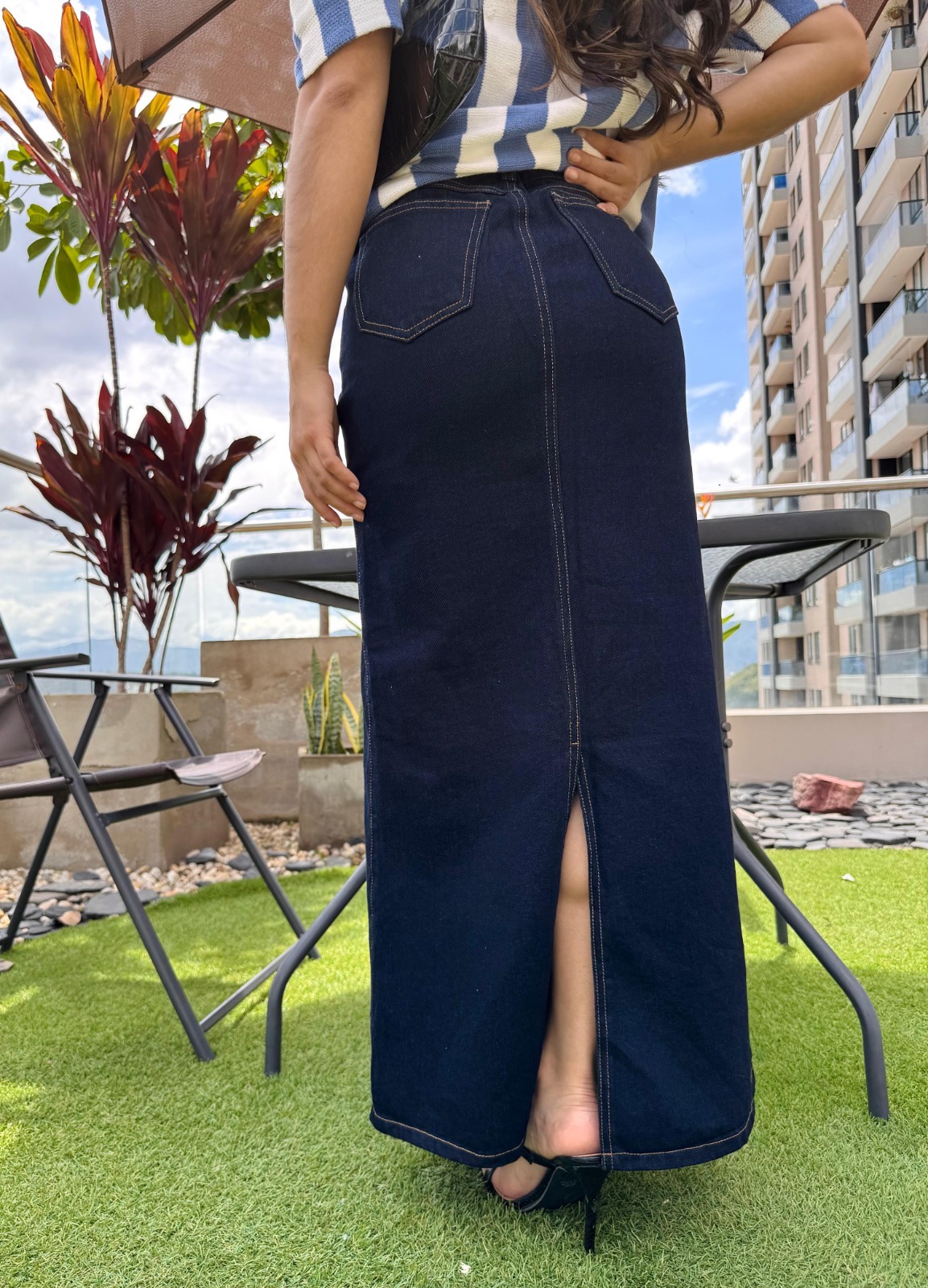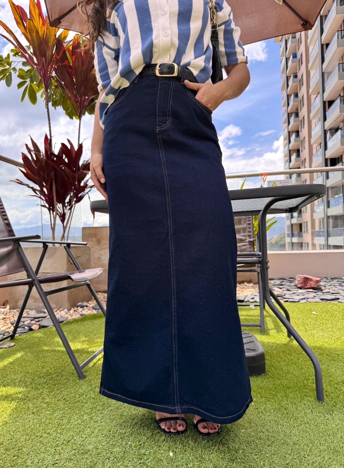Una pieza atemporal que combina elegancia y comodidad. La Falda Maxi Denim Azul Oscuro destaca por su silueta larga y estilizada, perfecta para crear looks sofisticados y casuales. Con costuras visibles que realzan su forma y un diseño de talle alto con bolsillos funcionales, es ideal para combinar con blusas ligeras o suéteres. Su tono profundo aporta un toque moderno y versátil que no pasa de moda.