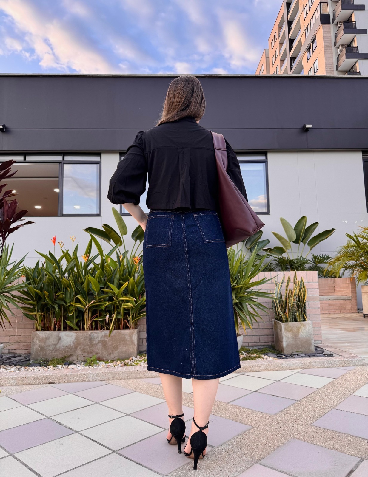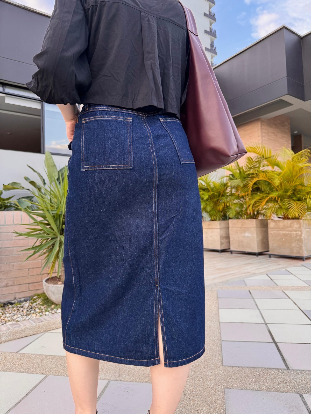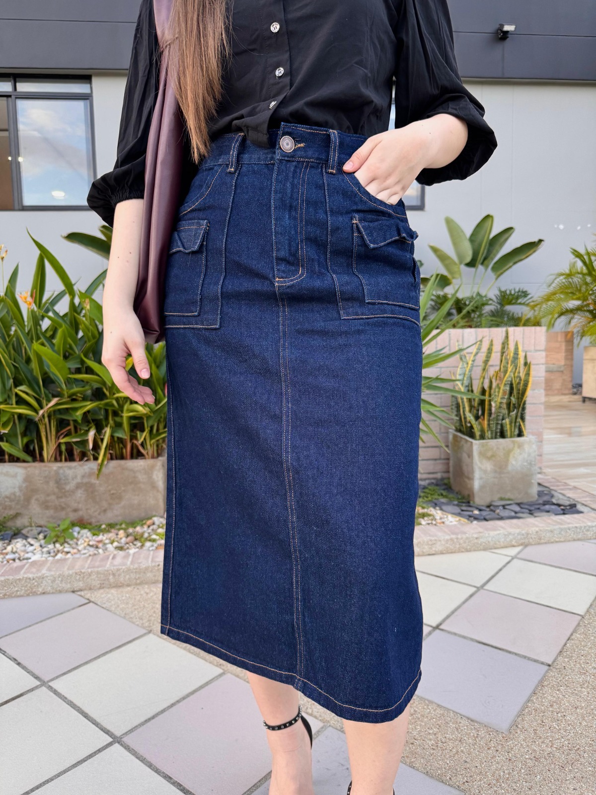 Falda midi en denim rígido con bolsillos tipo cargo al frente, un diseño moderno y versátil que combina estilo y practicidad. Perfecta para darle un toque urbano y sofisticado a tus outfits.